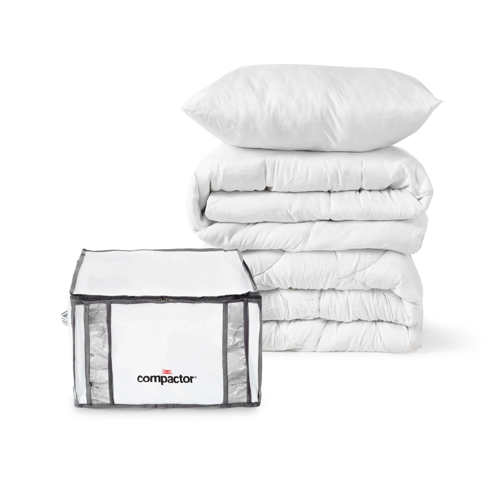 La housse peut contenir l’équivalent d’une couette une personne ainsi qu’un oreiller, tout en conservant une structure stable et uniforme une fois l’air aspiré. La compression est homogène et durable, facilitant le rangement saisonnier des couettes, plaids ou vêtements volumineux.