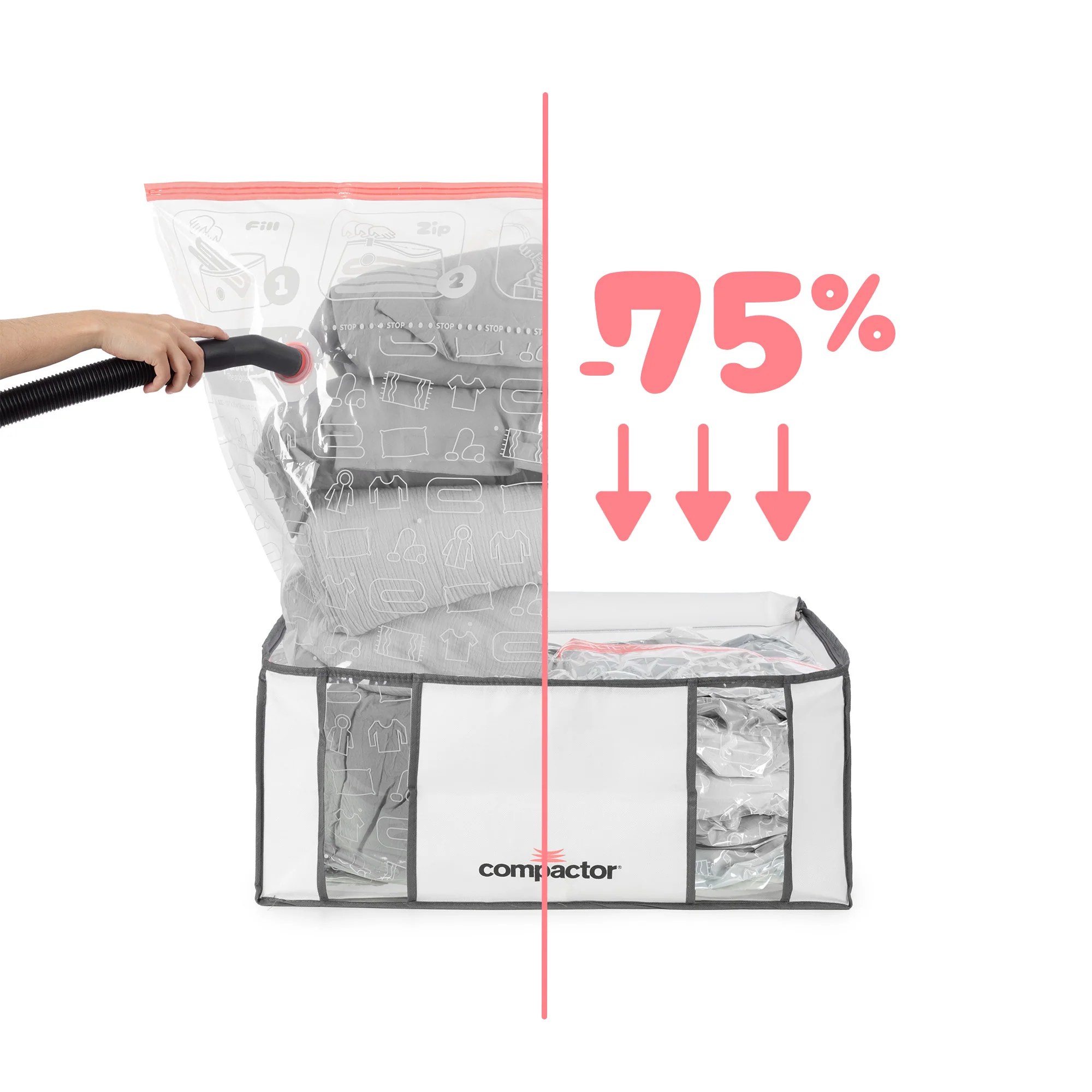 Grâce au système de compression, le lot 3 housses de rangement sous vide M-L-XXL permet de réduire le volume jusqu’à 75 %. Il suffit d’utiliser un aspirateur équipé d’un tuyau flexible pour extraire l’air et compresser efficacement le contenu.